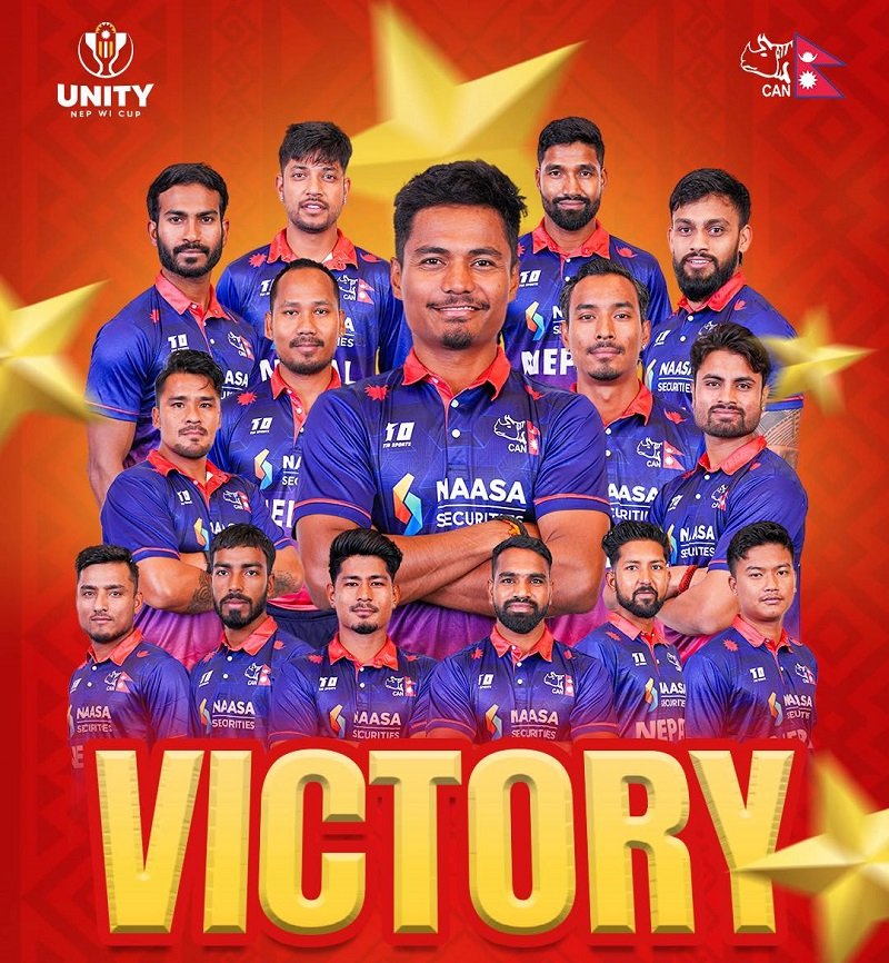 संयुक्त अरब इमिरेट्स (युएई) मा जारी युनिटी कप टी ट्वान्टी अन्तर्राष्ट्रिय सीरीजको पहिलो म्याच नेपालले ऐतिहासिक जित निकाल्दै सुखद् शुरुवात गरेको छ । दुई पटकको विश्वकप च्याम्पिन राष्ट्र वेष्ट इन्डिजलाई नेपालले १९ रनले पराजित गर्यो । नेपालले पहिलो पटक कुनैपनि आईसीसीको पुर्ण सदस्य राष्ट्र (टेष्ट, एकदिवसीय र टी ट्वान्टी मान्यता पाएको) लाई पराजित गरेको हो । यो जीत सँगै तीन खेलको श्रृङ्खलामा नेपाल १–० ले अगाडि बढेको छ ।